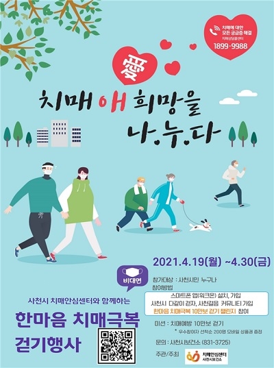 사천시 치매안심센터는 19일부터 30일까지 '2021년 한마음 치매극복 걷기행사'를 모바일 걷기 플랫폼(워크온)으로 연다고 밝혔다.