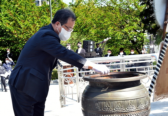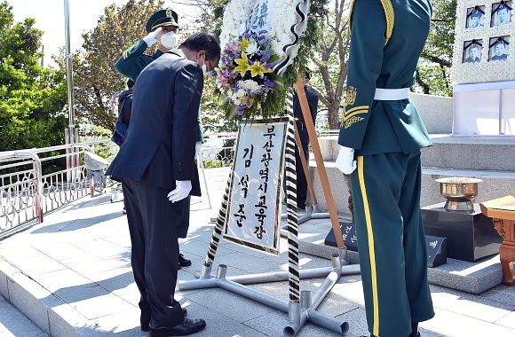 지난 19일 오전 부산 중앙공원 내 4.19 민주혁명희생자 위령탑 앞 광장에서 ‘4.19 혁명 61주기 기념식’이 열린 가운데 김석준 부산시교육감이 참석해 헌화와 분향을 하고 있다. 이날 기념식에는 박형준 부산시장과 김석준 시교육감을 비롯해 4.19 혁명 유공자, 유족 등 60여명이 참석한 가운데 진행됐다. (사진=부산시교육청 제공)