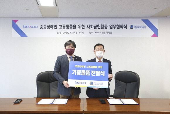 41회 장애인의 날을 맞아 벡스코에서 진행된 협약은 지역 내 취약계층인 장애인의 고용유지와 지역사회 발전을 위해 공동 협력하고 벡스코 주관 전시회에 부스 운영 지원, 후원 등에 나서기로 했다.