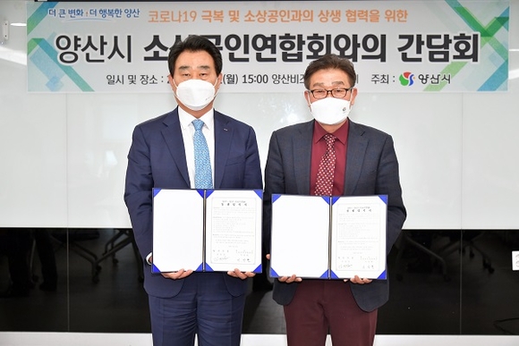 경남 양산시가 지난 19일 비즈니스센터에서 시 소상공인연합회와 간담회를 갖고 코로나19 극복 및 지역경제 활성화를 위한 상생협력에 뜻을 모았다.