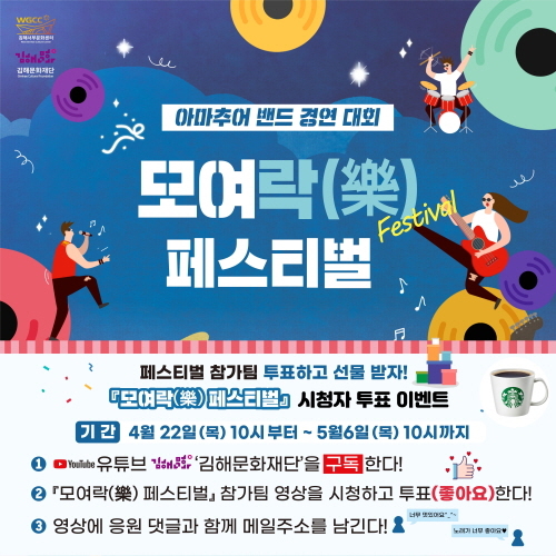 김해문화재단 김해서부문화센터에서 진행하는 아마추어 밴드 경연 대회 ‘모여락(樂) 페스티벌’의 시청자 투표가 오는 22일 오전 10시부터 시작된다. 영상은 재단 공식 유튜브 채널 ‘온택트 김해문화’에 공개될 예정이다.
