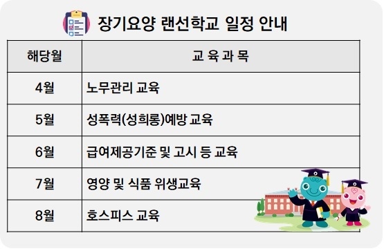교육과정은 △노무관리(4.16.) △성폭력(성희롱)예방(5.18.) △급여제공기준 및 고시(6.21.) △영양 및 식품 위생(7.20.) △호스피스 교육(8.19.) 등 총 5개 과정(과정별 1시간 교육)으로 구성돼 있으며, 교육과정 구성은 사전 현장 의견을 수렴한 결과 호스피스 교육 등 일선 현장에서 요청한 내용을 맞춤형으로 반영했다.