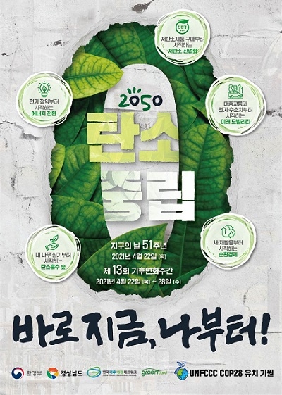 경남도가 51주년을 맞는 '지구의 날'을 기념해 22일부터 28일까지 제13회 기후변화주간을 운영하고, 생활 속에서 온실가스를 줄이기 위한 다양한 탄소중립 생활 실천 운동을 펼친다.