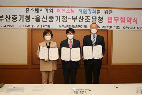 부산지방중소벤처기업청(부산중기청)과 울산중기청, 부산지방조달청이 지난 21일 부산중기청에서 ‘중소 벤처기업 혁신 조달 지원 강화’ 협약을 체결했다고 22일 밝혔다.