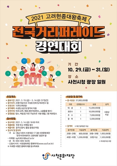 사천문화재단이 '2021년 고려현종대왕축제'의 프로그램인 전국거리퍼레이드 경연대회에 참가할 단체를 모집한다고 22일 밝혔다.