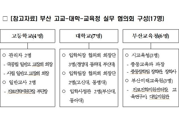 협의회에는 부산지역 고등학교를 대표해 장한구 국공립일반고교장회장, 이성학 사립일반고교장회장, 예병식 부산진학지원단장, 부산진학지원단 조병학 부단장 등이 참석한다. 또 대학에서는 부산대 김해영 입학본부장, 부산대 이찬웅 입학사정관, 동아대 장기철 입학사정관, 경성대 김진우 입학처장, 동의대 김삼열 입학홍보처장, 고신대 김화관 입학팀장, 동명대 이상우 입학팀장이 참석한다.