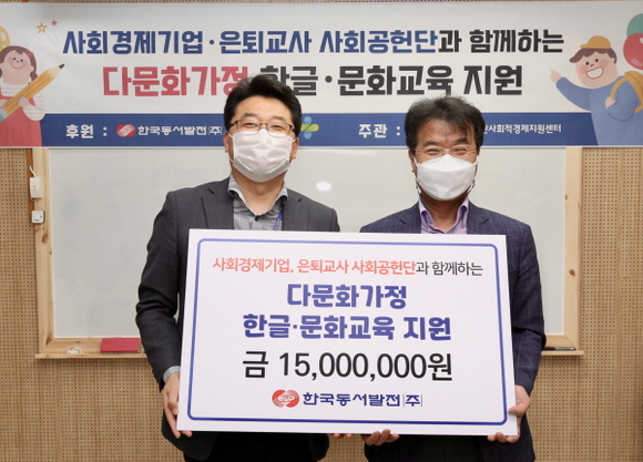 동서발전은 22일 울산사회적경제지원센터(울산 남구 소재)에서 안전보건공단과 함께 저소득 다문화가정을 대상으로 한글·문화교육 지원금 전달식(총 2300만원, 동서발전 1500만원, 안전보건공단 800만원)을 가졌다.