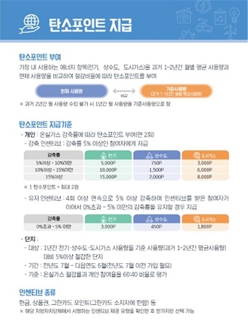 탄소포인트제는 가정, 학교, 상업시설, 아파트 단지 내에서 전기, 도시가스, 상수도 사용량을 줄여 기후변화의 원인 중 하나인 온실가스를 절감하기 위해 추진하는 프로그램이다.