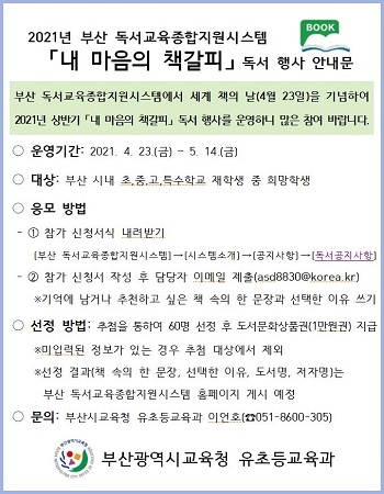부산시교육청이 오늘(23일)부터 내달 14일까지 부산지역 학생을 대상으로 책 속의 한 문장과 선택한 이유를 소개하는 ‘내 마음의 책갈피’ 온라인 독서 행사를 진행한다고 밝혔다.