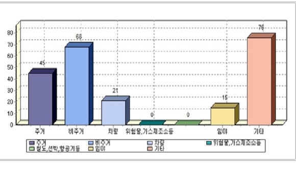 화재 장소별로는 상가, 산업시설 등 비주거시설에서 68건(30.2%), 주거시설 45건(20.0%), 차량 21건(9.3%), 임야 15건(6.7%) 순이다.