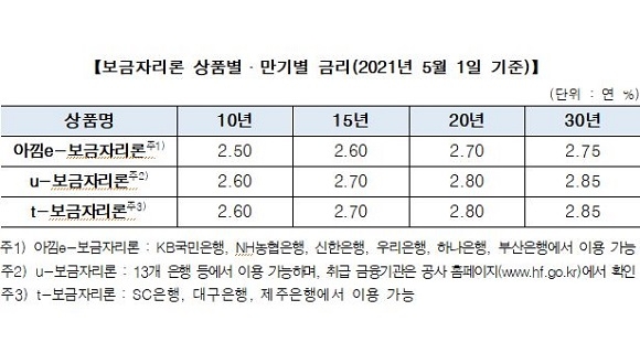 이에 주금공 홈페이지에서 신청하는 'u-보금자리론‘과 은행 창구에서 신청하는 ’t-보금자리론‘은 내달 1일부터 대출 만기에 따라 연 2.60%(만기 10년)에서 최대 2.85%(30년)로 이용할 수 있다.