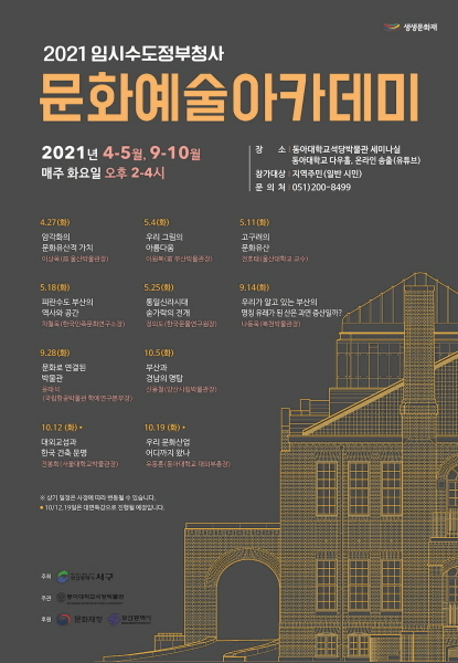 이달 27일부터 10월까지 모두 10차례 예정된 임시수도정부청사 문화예술아카데미는 ‘암각화의 문화유산적 가치(이상목 전 울산박물관장)’를 시작으로 ‘피란수도 부산의 역사와 공간(차철욱 한국민족문화연구소장)’, ‘부산과 경남의 명탑(신용철 양산시립박물관장)’, ‘우리 문화산업 어디까지 왔나(유동훈 동아대 대외부총장·전 문화부 제2차관)’ 등으로 진행된다.