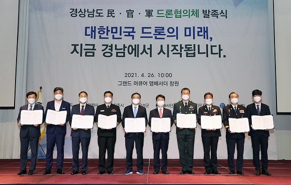 경남 창원시는 26일 오전 그랜드 머큐어 앰배서더 창원호텔 그랜드볼룸홀에서 11개 기관이 참여한 가운데 '경상남도 민·관·군 드론협의체' 발족식이 열렸다고 밝혔다.