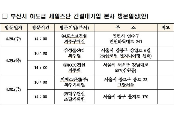 부산시와 16개 구·군, 전문 건설협회 등 10명이 참여하는 부산 하도급 홍보 세일즈단은 오는 28일부터 30일까지 3일간 수도권 소재 건설 대기업 본사를 전략 방문할 예정이다.