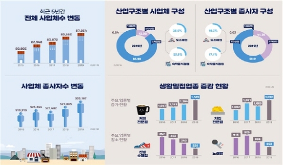 울산시가 최근 5년간(2015~2019) 지역 내 사업체 현황을 분석한 결과, 숙박·음식업과 서비스업 등 시민 생활 밀접업종을 중심으로 사업체가 꾸준히 증가한 것으로 나타났다.