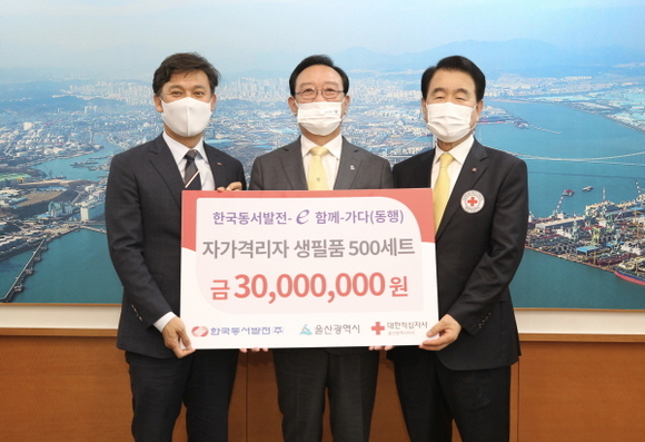 동서발전은 이날 울산시청에서 송철호 시장, 김영문 동서발전 사장, 김철 대한적십자회 울산광역시지사 회장 등이 참석한 가운데 ‘자가격리자 생필품 키트 전달식’을 진행했다. 동서발전은 울산 코로나19 확진자 급증으로 자가격리자 생필품 부족에 따라, 총 3000만원 상당 생필품 키트 500박스를 대한적십자사를 통해 울산시에 전달한다.