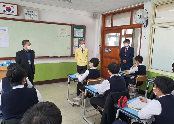 박 교육감은 김동욱 진해남중 교장으로부터 등교·원격수업 진행상황, 자가진단, 유증상자 관리, 방역인력 및 외부강사 관리, 학교시설 소독 등의 현황을 보고받았다.
