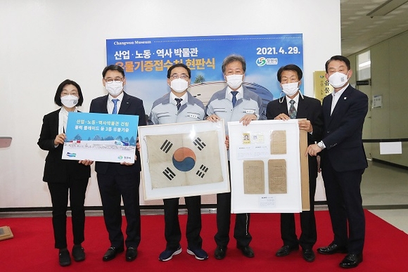 이어 진행된 유물 기증식에서는 창원시에 본사를 두고 있는 국내 대표 친환경 에너지 발전 기업인 두산중공업이 풍력발전기 블레이드 1점과 풍력터빈, 가스터빈 모형 각 1점 등 총 3점을 기증했다. 지역 근현대 역사자료 29만 여점을 수집·전시하고 있는 창원향토자료전시관 양해광 관장은 태극기(1945년 作) 1점과 봉급명세서(1974년 作) 등 6점을 기증했다. 향후 시는 유물기증과 관련해 LG전자 등 다른 기업과도협의할 예정이다.