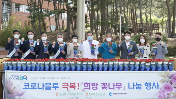 농협은행 기장군지부와 동부산농협은 30일 오전 의학원 야외 마당에서 기장군 코로나 방역의 선두에 서서 고생하는 의학원 의료진을 응원하고 지역 농가를 살리기 위해 지역에서 구매한 카네이션과 특산물 무료 나눔 행사를 가졌다.