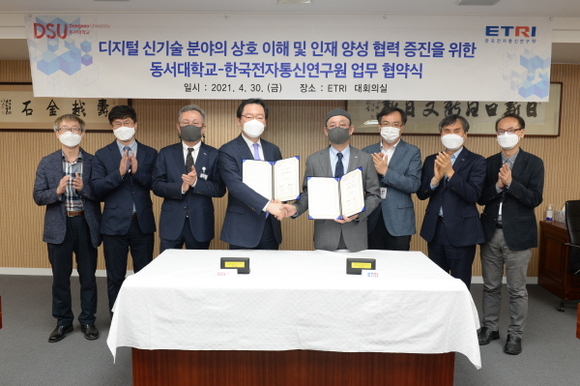 동서대학교는 지난달 30일 한국전자통신연구원(ETRI)과 지난 30일 디지털 신기술 분야의 상호이해 및 인재양성 업무협력 협정서를 체결했다고 2일 밝혔다.