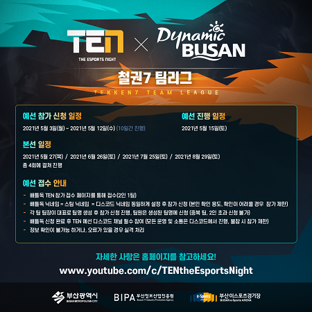 대회 방식은 철권 팬들의 만족도가 높았던 ‘태켄 크래쉬’ 형식의 ‘철권 팀 리그’ 방식으로 진행될 예정이다. TEN 2021 철권 시즌은 오는 27일, 내달 26일, 오는 7월 24일, 8월 28일에 방송될 예정이다.