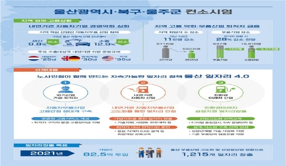 울산의 ‘고용안정 선제대응 패키지 지원사업’은 울산시, 북구, 울주군이 컨소시엄을 구성해 올해 2021년 4월부터 오는 2025년까지 5년간 추진된다.