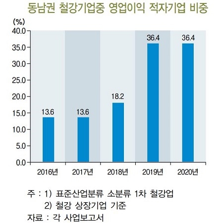 반면 장기간 업황이 침체했던 동남권 철강산업은 지역 상장사 가운데 영업이익 적자 기업 비중이 지난 2016년 13.6%에서 지난해 36.4%까지 오르는 등 활력이 크게 둔화한 상황이다. 이에 환경규제 대응을 위한 미래 투자 여력이 높지 않음을 보고서는 지적했다.