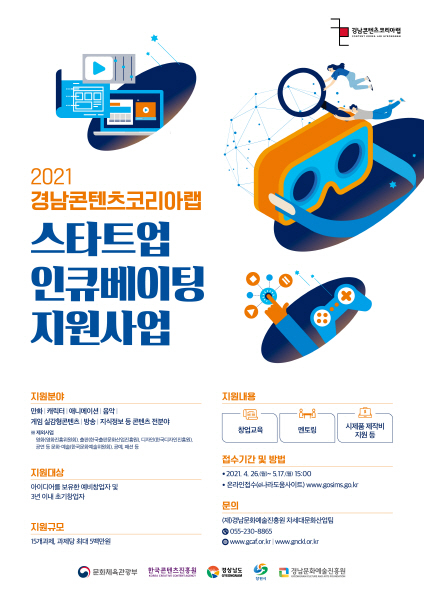 경남문화예술진흥원의 문화콘텐츠 분야 창작자·예비창업자를 위한 공간인 경남콘텐츠코리아랩이 ‘2021 스타트업 인큐베이팅 지원사업’의 참여자를 모집한다.