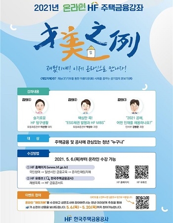 이번 강좌는 코로나19 확산 방지 차원에서 비대면 온라인 강의로 진행된다. 내용은 ▲‘슬기로운 HF 탐구생활’(주요 사업 소개) ▲’핵심만 콕! ESG 채권 발행과 HF MBS’(ESG채권과 MBS 소개) ▲‘HF 인사부에 묻다! 올해 공채, 어떤 인재를 채용하나요’ 등으로 구성된다.