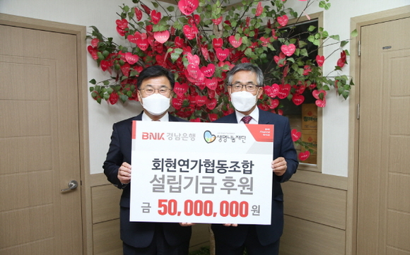 BNK경남은행은 6일 생명나눔재단에 ‘회현연가협동조합 설립기금 5000만원’을 기탁했다.