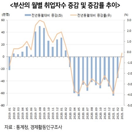 보고서에 따르면 지난해 초 코로나19 사태 발발 이후 부산의 취업자 수는 전국 평균치보다 더 큰 감소세를 보이고 있는 것으로 조사됐다. 특히 핵심연령층인 20~49세 취업자 감소가 두드러졌다.