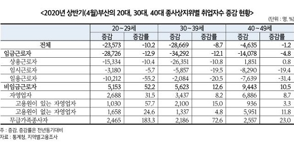 더 큰 문제는 20~49세 취업자 가운데 상용근로자가 무려 4만여명 정도 크게 감소한 것으로 집계된다는 것이다. 반면 부산지역 자영업자와 무급 가족 종사자는 각 1만 3000여명, 7200여명 늘며 증가세를 보였다.