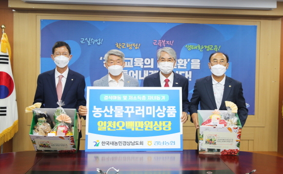 경남농협과 (사)한국새농민중앙회경남도회는 10일 가정의 달을 맞아 경상남도교육청에서 결식아동 및 저소득층 자녀를 돕기 위해 농산물꾸러미 300상자를 전달했다.