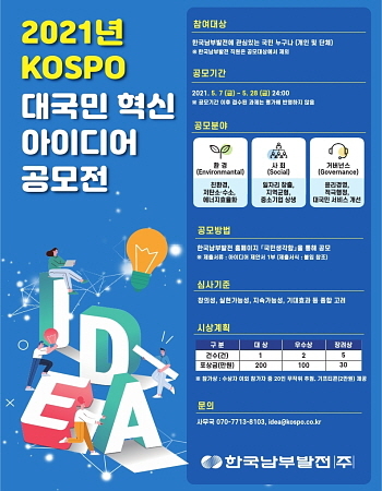 한국남부발전㈜이 ESG 경영 선도를 위한 대국민 혁신 아이디어 공모전을 열고 오는 28일까지 다양한 아이디어를 모집한다고 10일 공고했다.