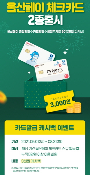 울산페이체크카드 일반형 또는 다자녀형을 신규 발급받고 누적 이용액 5만원 이상 결제하면 선착순 4000명에게 3000원을 캐시백 혜택을 제공한다.