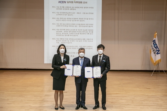 김회천 남동발전 사장은 선서식에서 “이해충돌방지법 제정으로 공공기관 직원의 의무와 책임이 강화된 만큼 윤리청렴인식의 재무장을 통해 국민에게 신뢰받는 기업으로 자리매김하도록 솔선수범하겠다”고 말했다. 김 사장은 오는 13일 이사회를 통해 기관장 직무청렴계약을 체결할 예정이다.