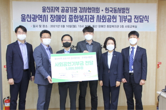 한국동서발전은 울산지역 공공기관 감사협의회와 10일 울산 중구 ‘울산광역시 장애인종합복지관’에서 사회공헌기부금 전달식을 가졌다고 10일 밝혔다.
