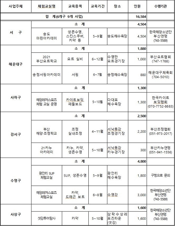 체험장이 있는 장소는 ▲송도해수욕장(생존수영, 스킨스쿠버, 카약) ▲다대포해수욕장(노르딕워킹, 필라테스, 카이트보딩, 패들보드) ▲송정해수욕장(노르딕워킹, 서핑) ▲해운대해수욕장·수영요트경기장(노르딕워킹, 요트) ▲낙동강(카누, 카약, 조정) ▲수영강(카약, 드래곤보트) 등이다.