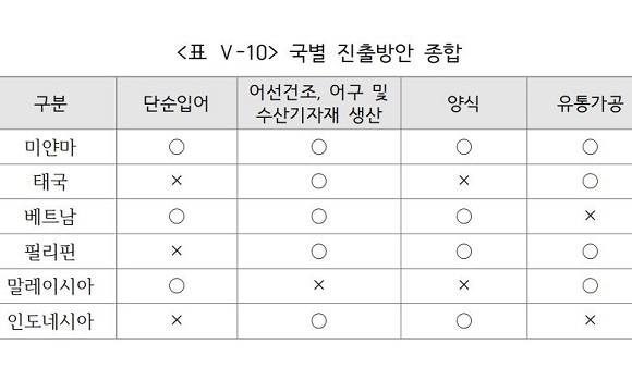 보고서를 작성한 신영태 한국수산어촌연구원장은 “이런 점을 고려했을 때 어선어업을 허용하는 일부 국가에 대해 단순 입어나 합작을 통한 입어를 추진할 필요가 있다. 양식업은 인근 지역 어업자와 공동으로 진출할 필요가 있다”며 “아세안 국가는 외국 어선에 의한 생산보단 자국 어선에 의한 생산 증대를 선호하고 있어 자국에서의 어선 건조시설 확충을 희망하고 있다. 이에 중소어선 건조, 수리업체, 어망을 비롯한 수산기자재 업체는 아세안 국가 진출을 적극 추진할 필요가 있다”고 주장했다.