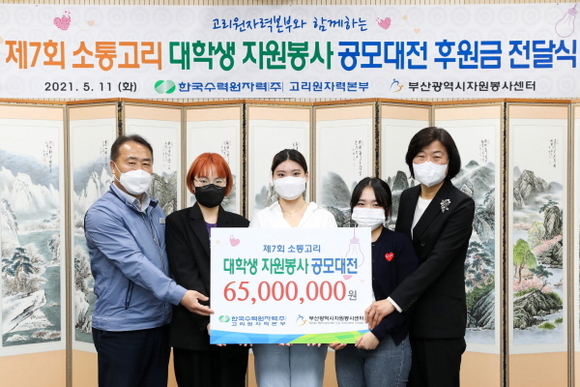 한국수력원자력 고리원자력본부는 부산광역시시자원봉사센터와 함께 대학생 재능기부 자원봉사 확산을 위한 ‘제7회 소통고리 대학생 자원봉사 공모대전’ 후원금 전달식을 가졌다. (사진=고리본부 제공)