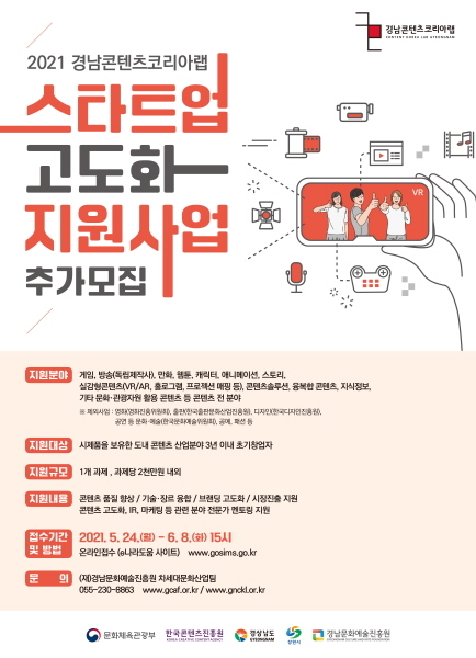 경남문화예술진흥원 경남콘텐츠코리아랩이 2021 스타트업 고도화 지원사업의 참여기업을 추가 모집한다.
