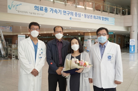 (왼쪽부터) 대장항문외과 한언철 과장(주치의), 선호범(환우, 남편) 이선희(최우수상 수상자, 아내), 박상일 동남권원자력의학원장이 기념촬영을 하고 있다. (사진=동남권의학원 제공)