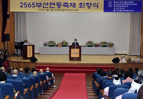 지난 16일 오후 부산진구 한국자유총연맹 부산지부 대강당에서 ‘2565 부산연등축제 회향식’이 열린 가운데 김석준 부산시교육감(중앙)이 행사에 참석해 축사를 전하고 있다.
