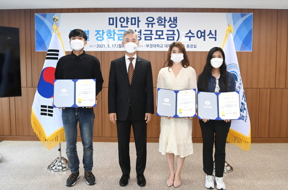 부경대는 17일 오전 대학본부 5층 총장실에서 ‘미얀마 유학생을 위한 특별 장학금(성금모금) 수여식’을 열고, 부경대 미얀마 유학생들에게 성금을 전달했다.