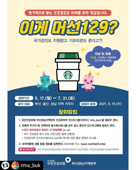 경품 이벤트에 참여하는 방법은 국가검진 홍보 게시물이나 검진을 받고 있는 인증샷을 지정된 해시태그와 함께 본인의 인스타그램에 게시하고, 네이버폼에 상품을 받기 위한 정보를 입력하면 된다. 경품은 부산·울산·경남지역 거주자 중 100명을 선정해 스타벅스 카페라떼 2잔을 제공한다.