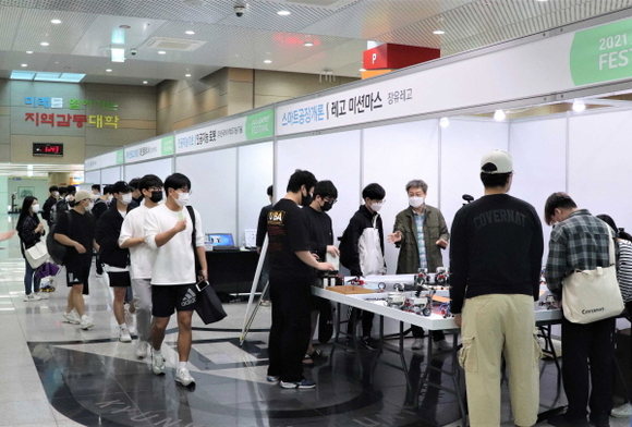 이어 창조관 로비에서는 4차 산업혁명 기술을 직접 체험할 수 있는 체험부스가 마련됐다. 사업단에서 운영 중인 6개 기초교과목(스마트공장개론, 4차산업혁명개론, 빅데이터자료처리, 파이썬프로그래밍, 인공지능기초, AR/VR) 소개와 상시 체험부스(레고, 인공지능, 드론, AR/VR, 라인트레이서)가 진행되면서 학생들에게 큰 호응을 얻었다.