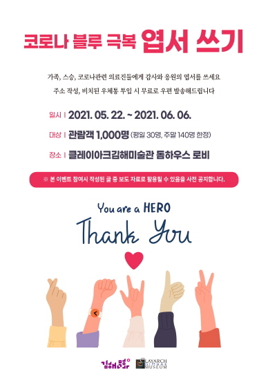 김해문화재단 클레이아크김해미술관은 오는 22일부터 6월 6일까지 ‘코로나 블루 극복 엽서쓰기 이벤트’를 개최한다고 21일 밝혔다.