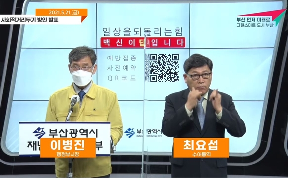 부산시 방역당국은 21일 오후 1시 30분 유튜브 등으로 온라인 기자회견을 열고 이병진 행정부시장이 거리두기 하향 조정에 대한 사항을 발표했다.