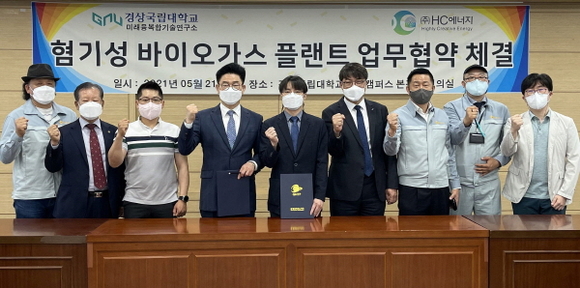 경상국립대학교(GNU) 미래융복합기술연구소와 (주)HC에너지는 21일 칠암캠퍼스 대학본부 회의실에서 지역 발전과 창의인력 양성 및 기술개발, 혐기성 바이오가스 플랜트 관련 업무의 포괄적 협력을 위한 협약을 체결했다.