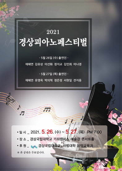 경상국립대학교(GNU)는 오는 26일과 27일 오후 7시 가좌캠퍼스 예술관 콘서트홀에서 ‘2021 피아노 페스티벌’을 마련한다. 공연은 무관중으로 진행되며, 온라인으로 실시간 중계된다.